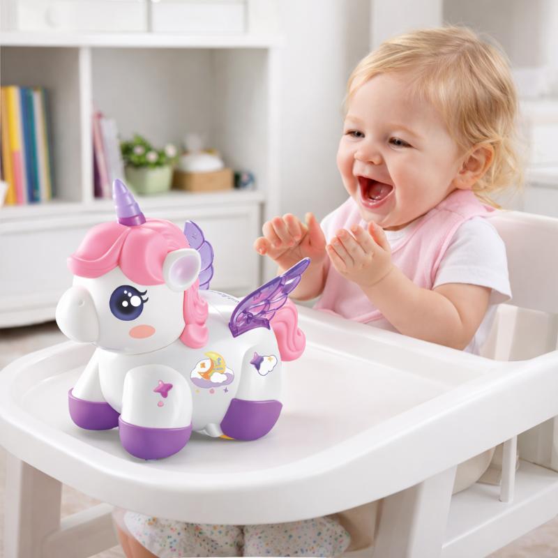 Frolicra boasts fluid 360° rotation and whimsical walking actions that effortlessly capture children's attention. As it twirls and glides, vibrant LED lights sparkle and joyful sounds resonate, forming an immersive play atmosphere that feels dynamic and exhilarating. The unicorn's charming design and animated movements keep kids fascinated, entertained, and eager to join in the fun.