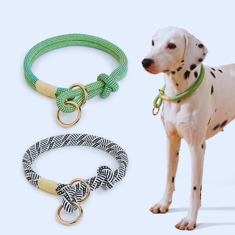I like that it’s quick to put on, no buckles or fuss. the rope is thick and feels comfortable on my dog’s neck. it does loosen a bit after a lot of pulling but that’s normal for this style